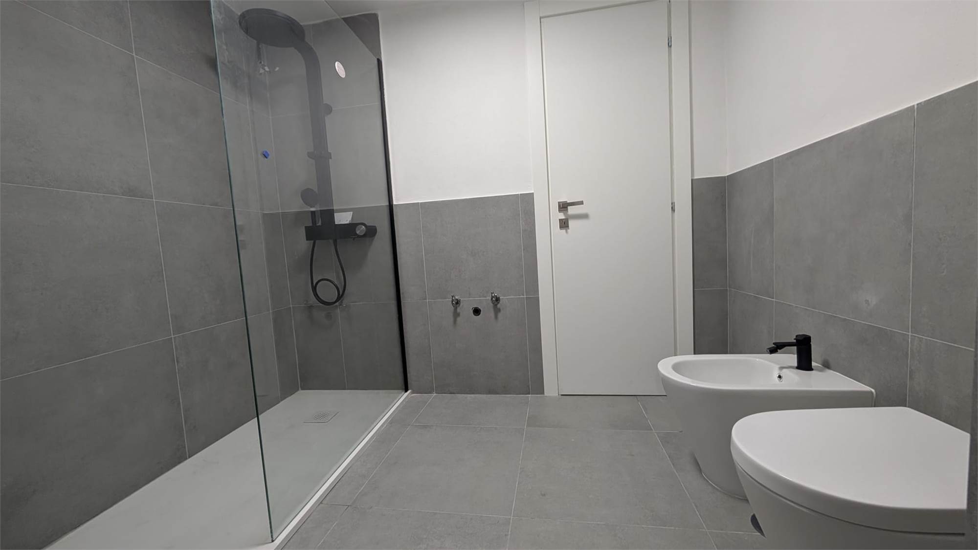 Ampio bagno completo di box doccia e zona servizi adiacente con attacco lavatrice.